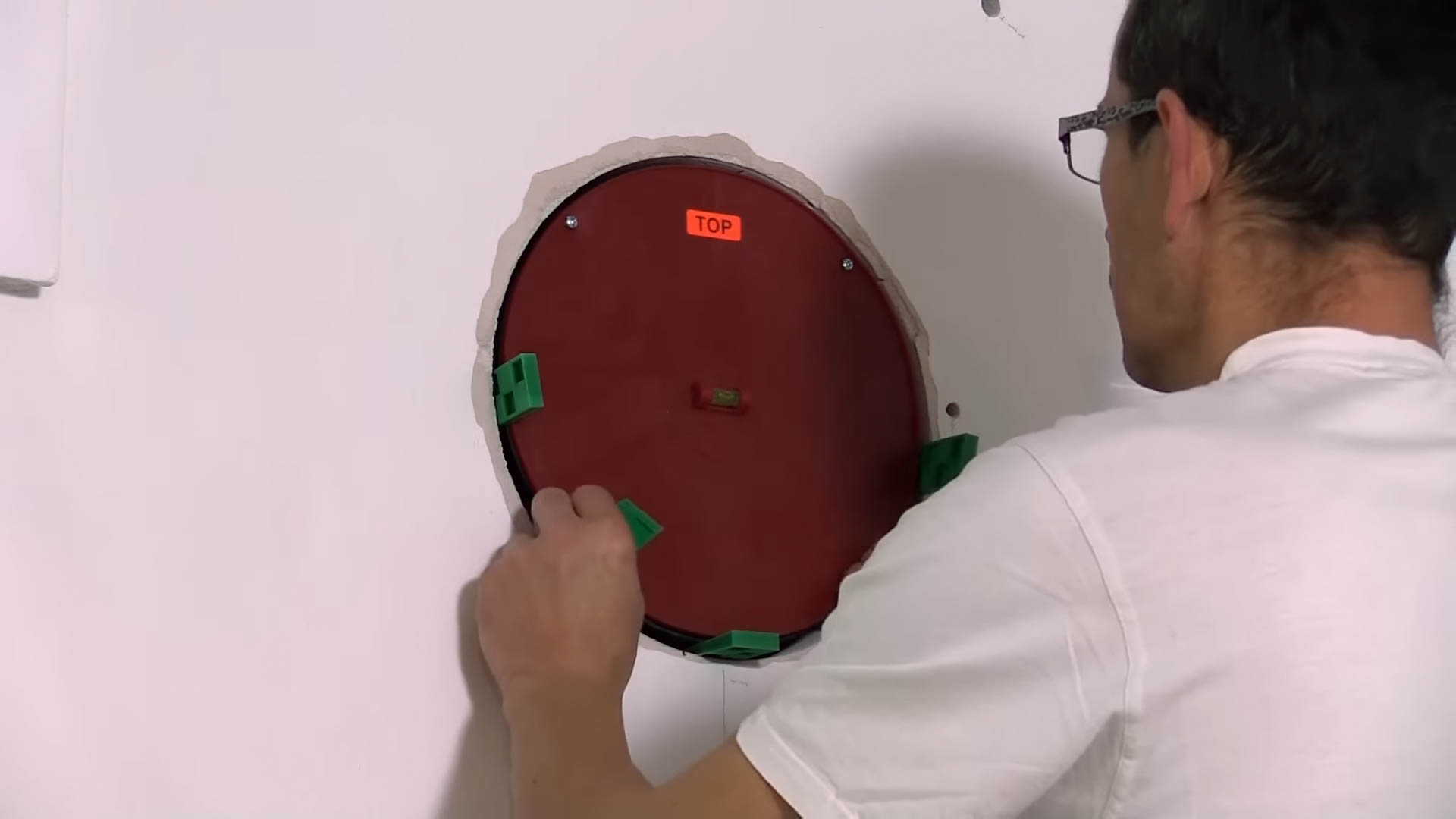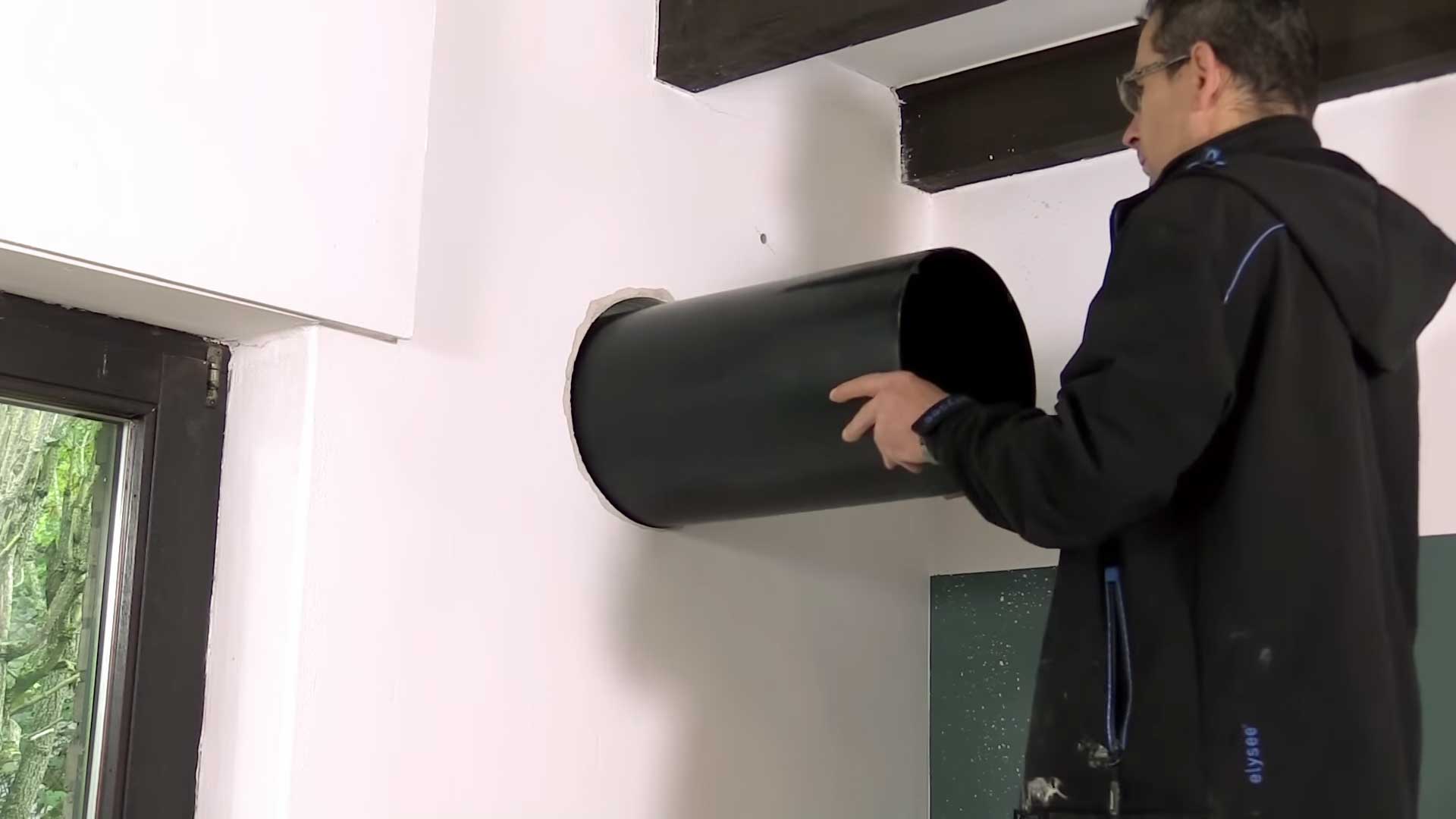 Schiebe jetzt das gekürzte Lüftungsgerät von innen bis zum Anschlag in das Mantelrohr - die Lüfter müssen sich dabei auf der Außenseite befinden. Zur genauen Ausrichtung setzt du einfach den Putzdeckel mit der integrierten Wasserwaage auf.