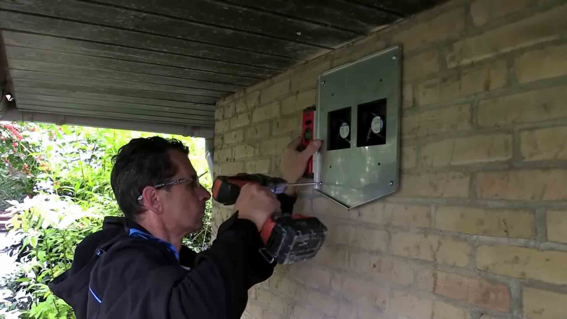 Schraube zunächst die Abdeckplatte im Inneren fest und verbinde das Lüftungsgerät mit der Stromversorgung. Im Anschluss befestige die Filterhalter, setze die Filter ein und stecke die Innenhaube auf. Im Anschluss bringst du die Abdeckplatte im Außenbereich an. Befestige dafür zunächst Dichtband auf der Rückseite und verschraube die Platte anschließend am Mauerwerk und dem Mantelrohr.