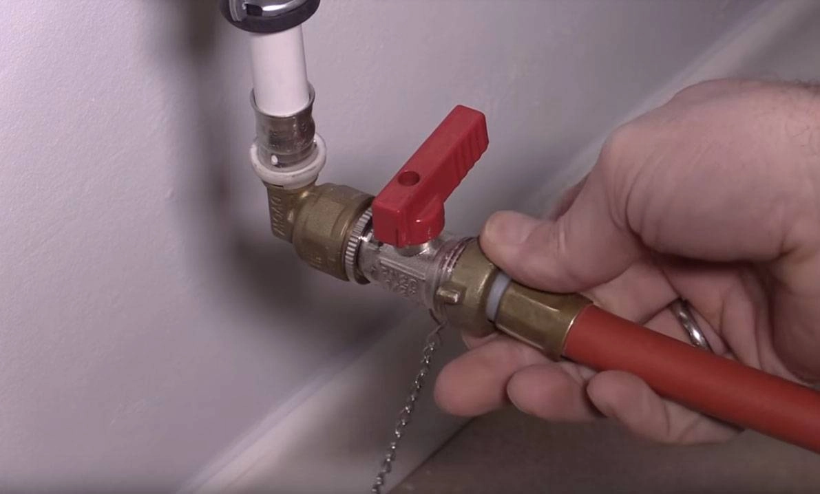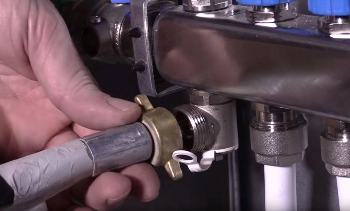 Nun wird ein Wasserschlauch an den KFE-Hahn des Vorlaufbalkens des Heizkreisverteilers angeschlossen und dieser mit dem Zapfventil der Wasserquelle verbunden: