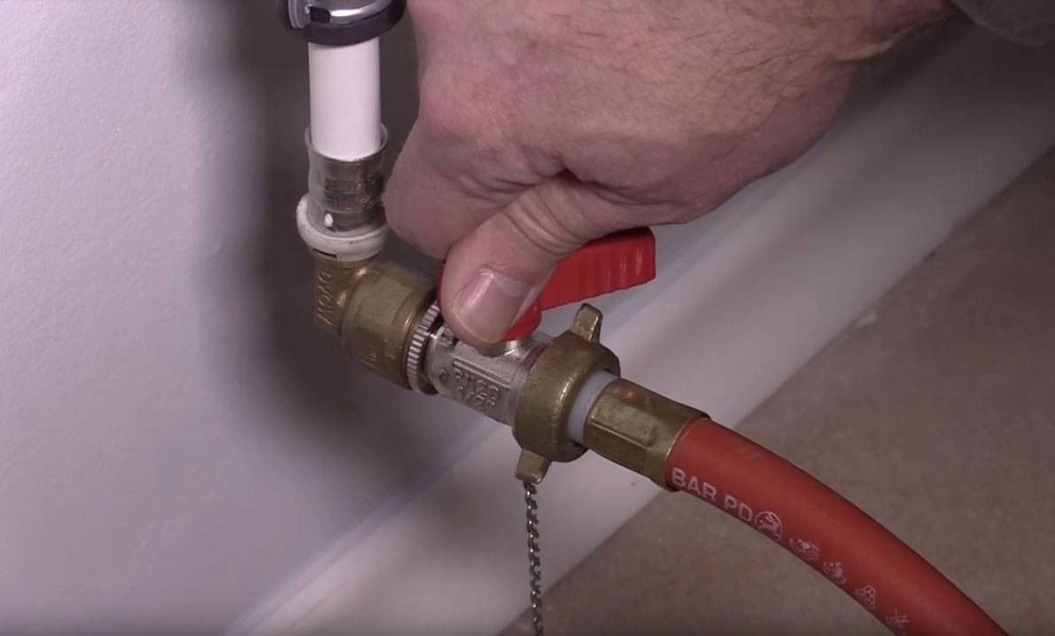Im nächsten Schritt wird ein Schlauch an den KFE-Hahn des Rücklaufbalkens angeschlossen und entweder zu einem freien Abfluss (z. B. Toilette, Waschbecken, Badewanne, Bodenlauf) oder zum Vorratsbehälter der Spül- und Befüllpumpe geführt: