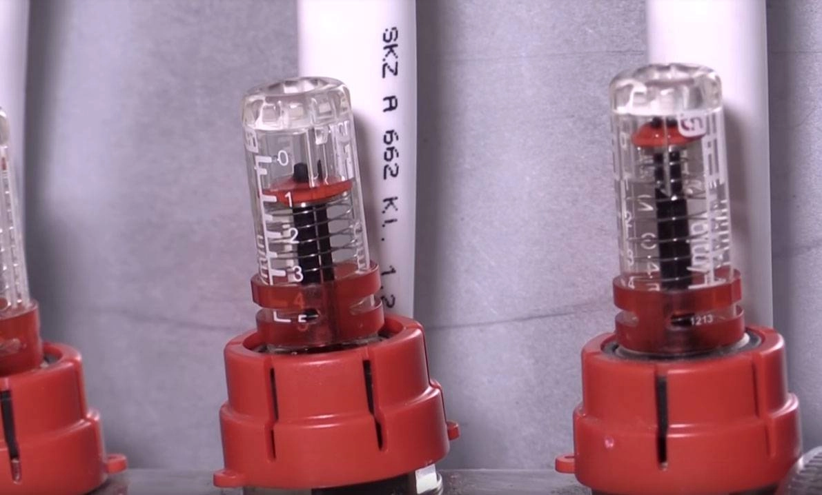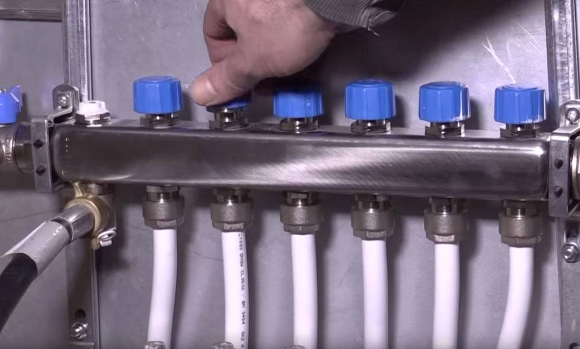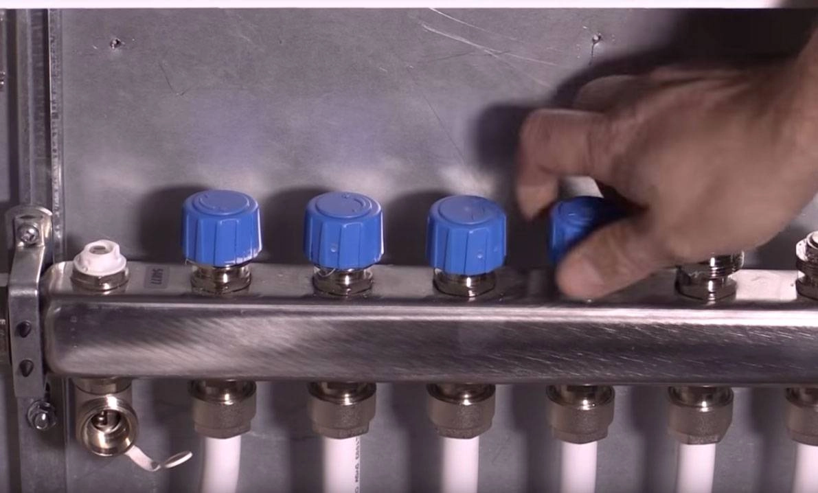 Wurden alle Heizkreise gespült, werden nacheinander das Entlüftungsventil des Vor- und das des Rücklaufbalkens des Heizkreisverteilers geöffnet, um eventuell noch darin enthaltene Luft aus dem System zu entfernen: