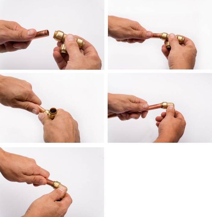 Jetzt das Steckfitting T-Stück aus Kupfer mit einer leichten Drehbewegung auf das Kupferrohr stecken. Nach dem deutlich hörbaren „Klick“ ist eine dauerhaft dichte Verbindung hergestellt.