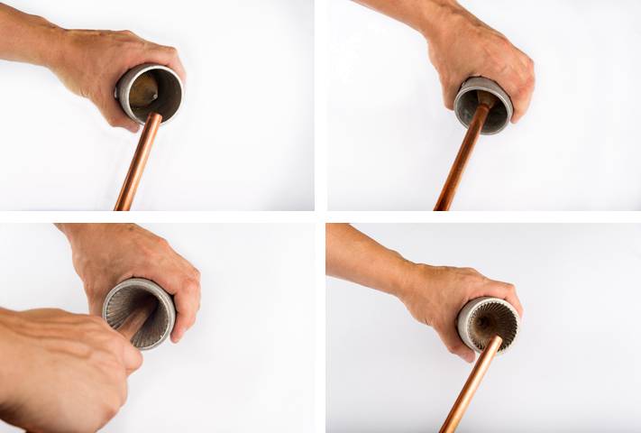 Mit dem Universal-Entgrater das Rohr nun innen und außen entgraten und leicht anschrägen. Wichtig ist dabei, alle Restspäne zu entfernen und zudem die notwendige Einschublänge auf dem Rohr zu markieren. Damit ist gewährleistet, dass das Rohr den O-Ring passiert. Nur so ist die Dichtheit der Verbindung gesichert.