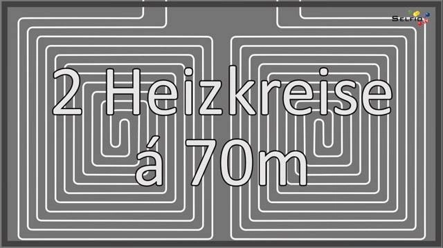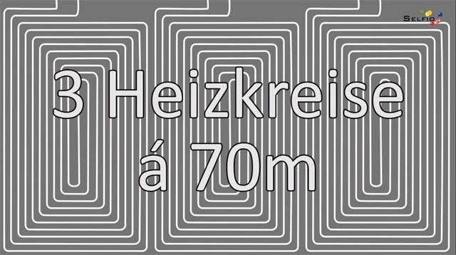 Die Anzahl der Heizkreise erhöht sich in diesem Fall auf 3. Die einzelnen Heizkreise sollten dann jeweils etwa 70 m plus Zuleitung lang sein.