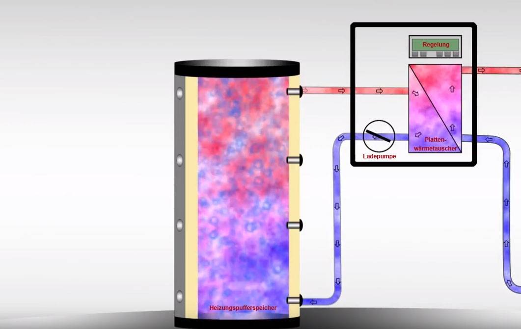 Bei der Warmwasserentnahme fördert die Ladepumpe warmes Wasser aus einem Heizungspufferspeicher zum Wärmetauscher. Dieser wird im Gegenstromprinzip vom kalten Frischwasser durchflossen. Hier werden das zu erwärmende Trinkwasser und das heiße Heizungswasser – getrennt durch die Wärmetauscherlamellen – aneinander vorbeigeführt. Dabei gibt das heiße Heizungswasser seine Wärmeenergie an das Trinkwasser ab, das dadurch auf die gewünschte Temperatur erhitzt wird.