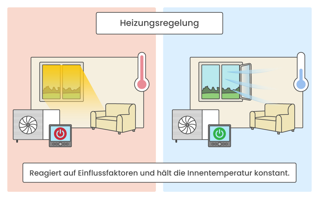 Die Heizungsregelung sorgt nicht nur dafür, dass eine bestimmte Temperatur erreicht wird. Sie bezieht auch Faktoren mit ein, die die Erwärmung entweder hemmen oder verstärken, wie z.B. einströmende Luft durch Fenster oder zusätzliche Aufheizung des Raumes durch Sonneneinstrahlung.