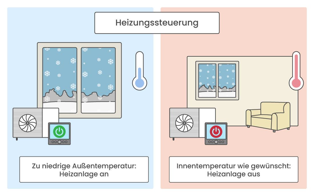 Sorgt z.B. dafür, dass die Wärmepumpe automatisch den Betrieb aufnimmt, sobald die Außentemperatur unter einen bestimmten Wert sinkt. Die Wärmepumpe läuft dann so lange, bis sich der Innenraum auf eine bestimmte Temperatur erwärmt hat.