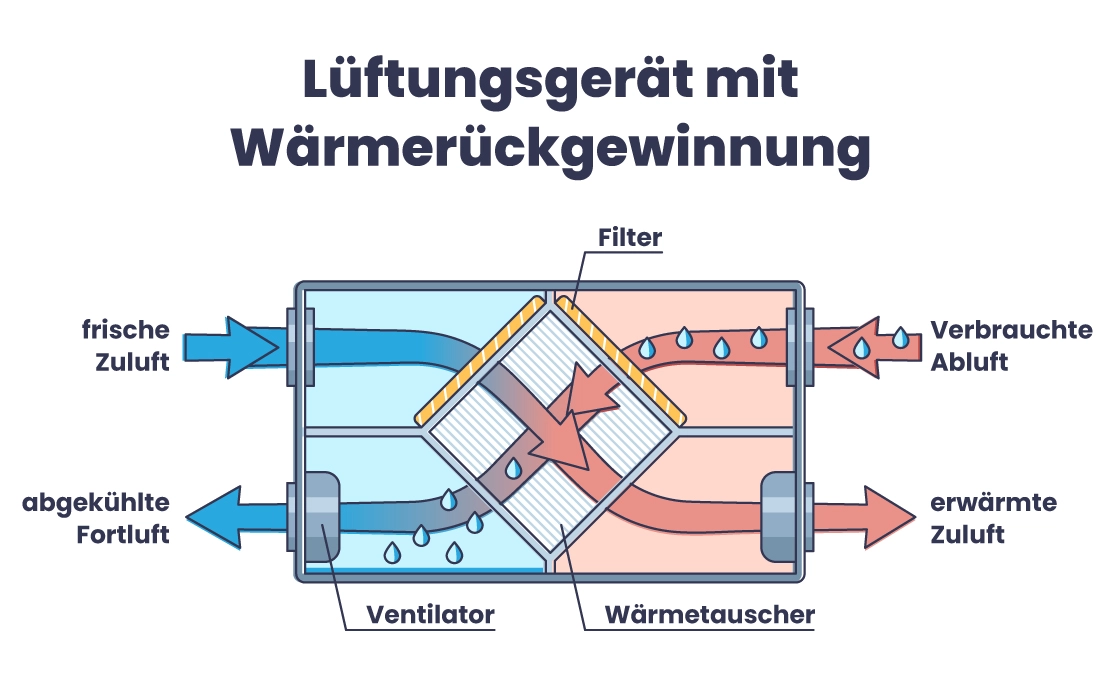 Bei Lüftungsgeräten, die mit Wärmerückgewinnung ausgestattet sind, kommt ein Speichermedium zum Einsatz, das aus Keramik, Aluminium oder Edelstahl bestehen kann. Sind die Ab- und Zuluft getrennt, handelt es sich um einen rekuperativen Wärmeübertrager. Die kalte Außenluft strömt an der warmen Abluft vorbei, wobei die Wärmeenergie von einem Luftstrom auf den anderen übertragen wird. Spezielle Trennwände verhindern, dass sich die beiden Luftströme vermischen, sodass die Zuluft frei von Gerüchen, Partikeln oder Feuchtigkeit der Abluft bleibt.