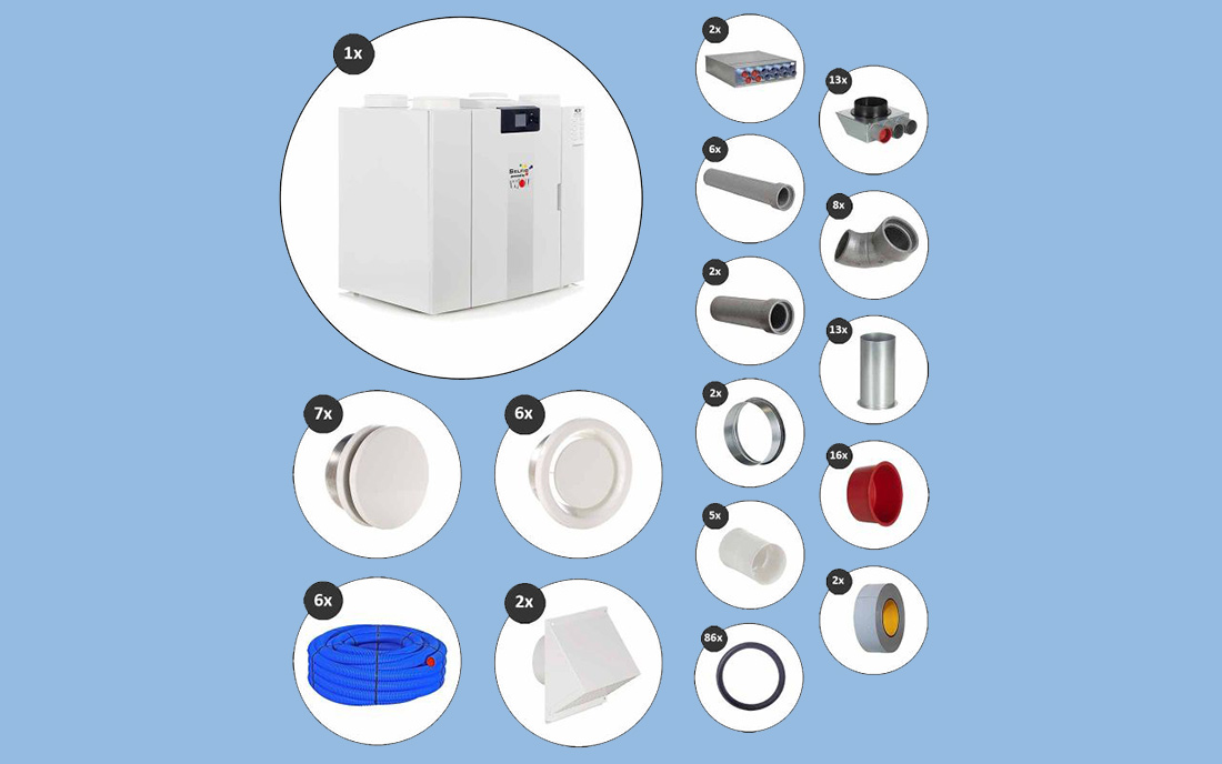 Das Set beinhaltet ein zentrales Lüftungsgerät sowie alle Komponenten, die du zur Montage der zentralen Lüftungsanlage benötigst:
