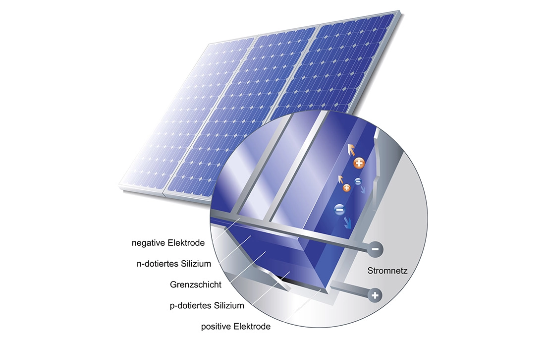 - erzeugen in Solarzellen elektrischen Strom mit Gleichspannung und transportieren diesen zum Wechselrichter (oder zum DC-Stromspeicher)